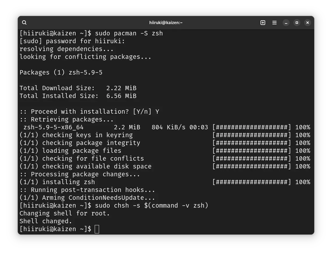 $ sudo pacman -S zsh