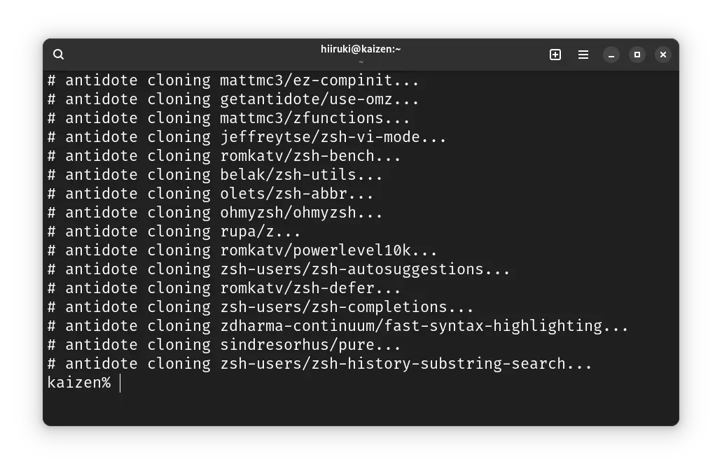 $ antidote bundle <~/.zsh_plugins.txt >~/.zsh_plugins.zsh
