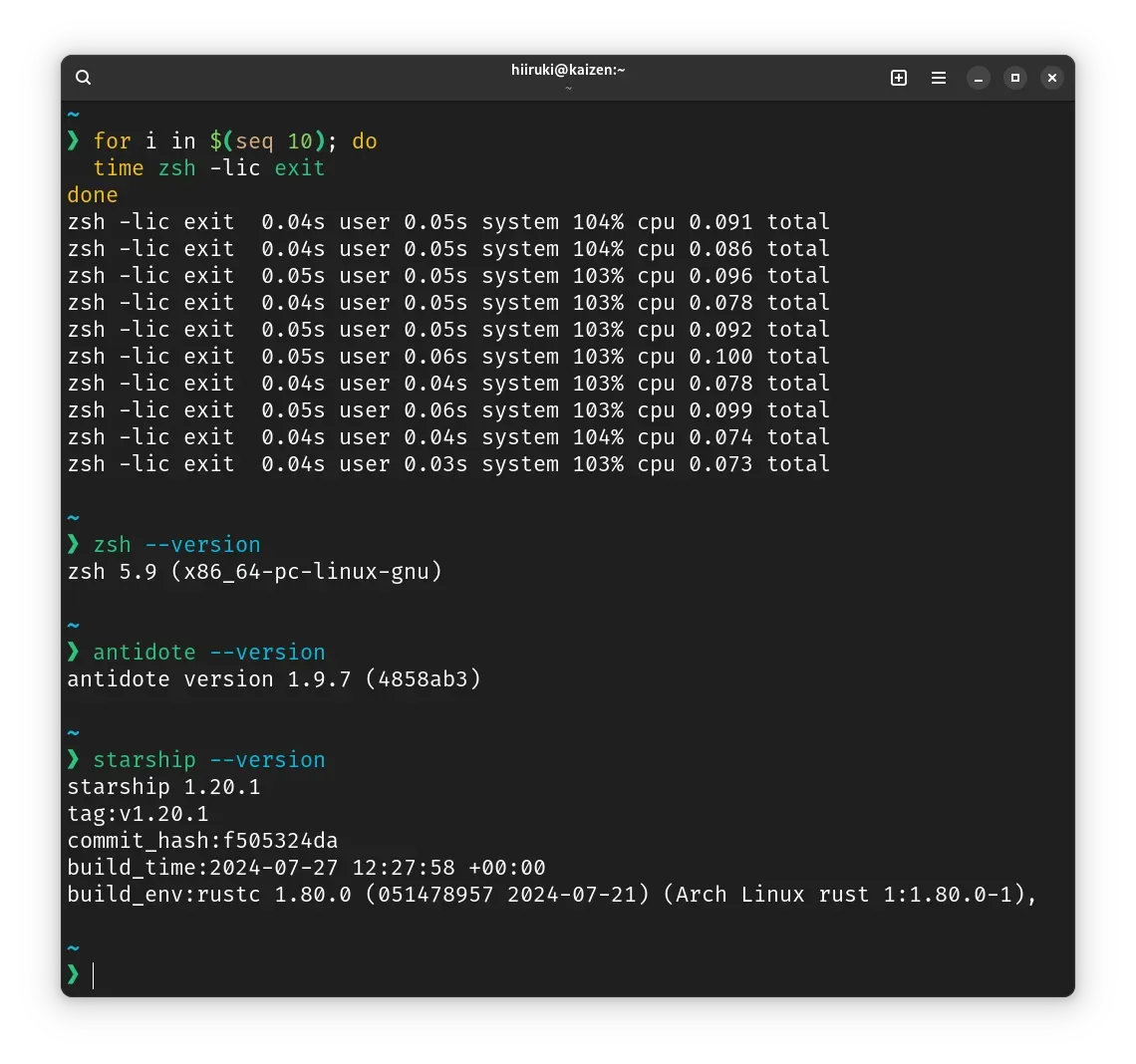 I found that Antidote is faster than oh-my-zsh, and Starship is a cool, fast prompt written in Rust that gets updated frequently. While there are many other prompt alternatives like Powerlevel10k, I prefer Starship because it’s simple and fast. Some people might prefer Powerlevel10k because it has a transient prompt feature, and I’ve heard it’s faster than Starship. However, I also use Powerlevel10k, and I’ve found that the performance gap is not that significant. I plan to write a post comparing Starship and Powerlevel10k in the future.